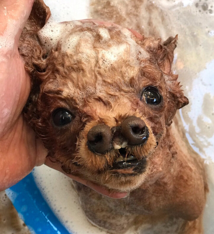 【写真右】生まれつき脳の障がいがあるため左右の半分が麻痺してしまい、3時間置きに離乳食を与えて3年半の命を終えた障がい犬のうーちゃん。お鼻が二つあるのがチャームポイントでした。この子との出会いで経験した障がい犬の存在、1頭でも多くの障がい犬の命を救っていきたい。(一般社団法人日本障害犬支援センター代表の方より)